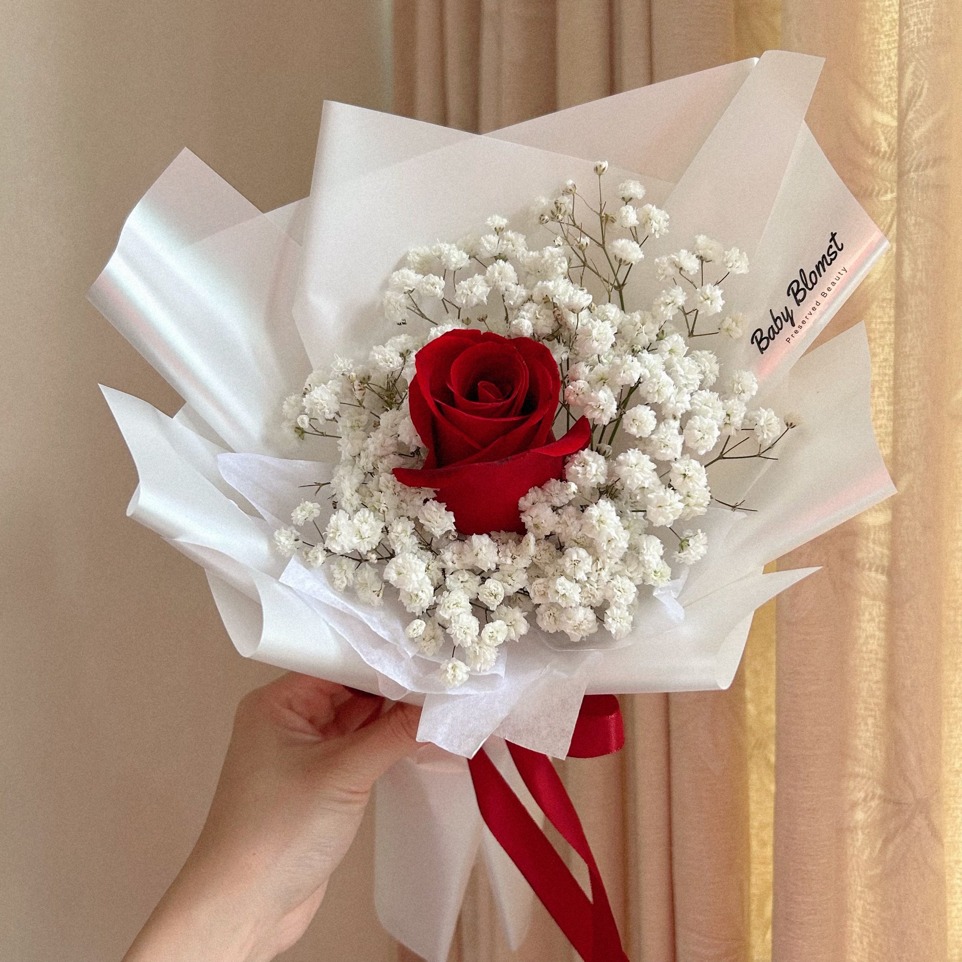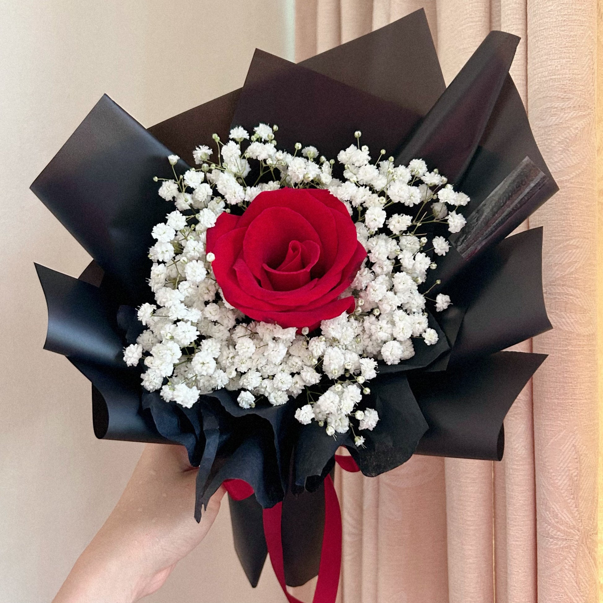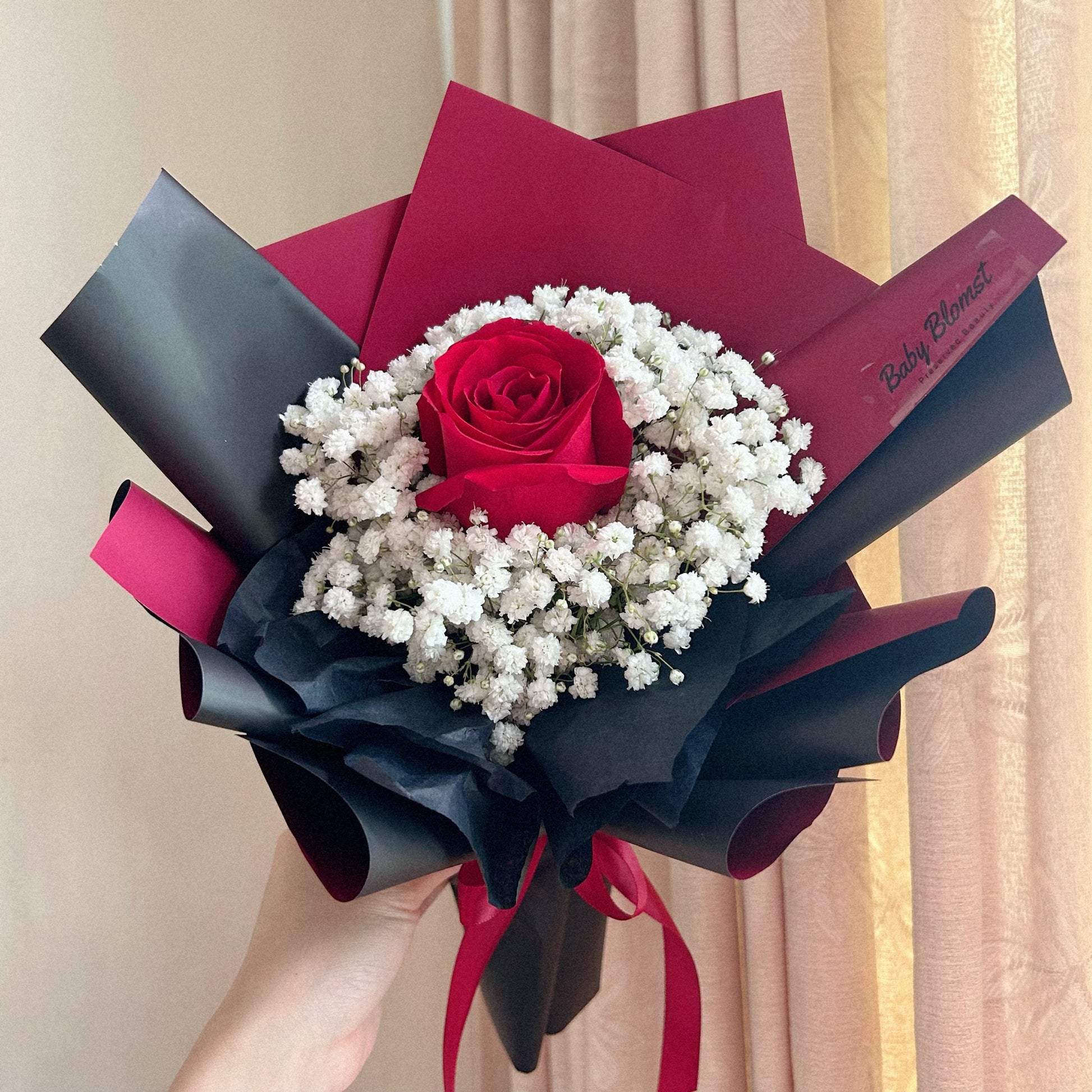 This Product Includes: Fresh red rose and baby breath.